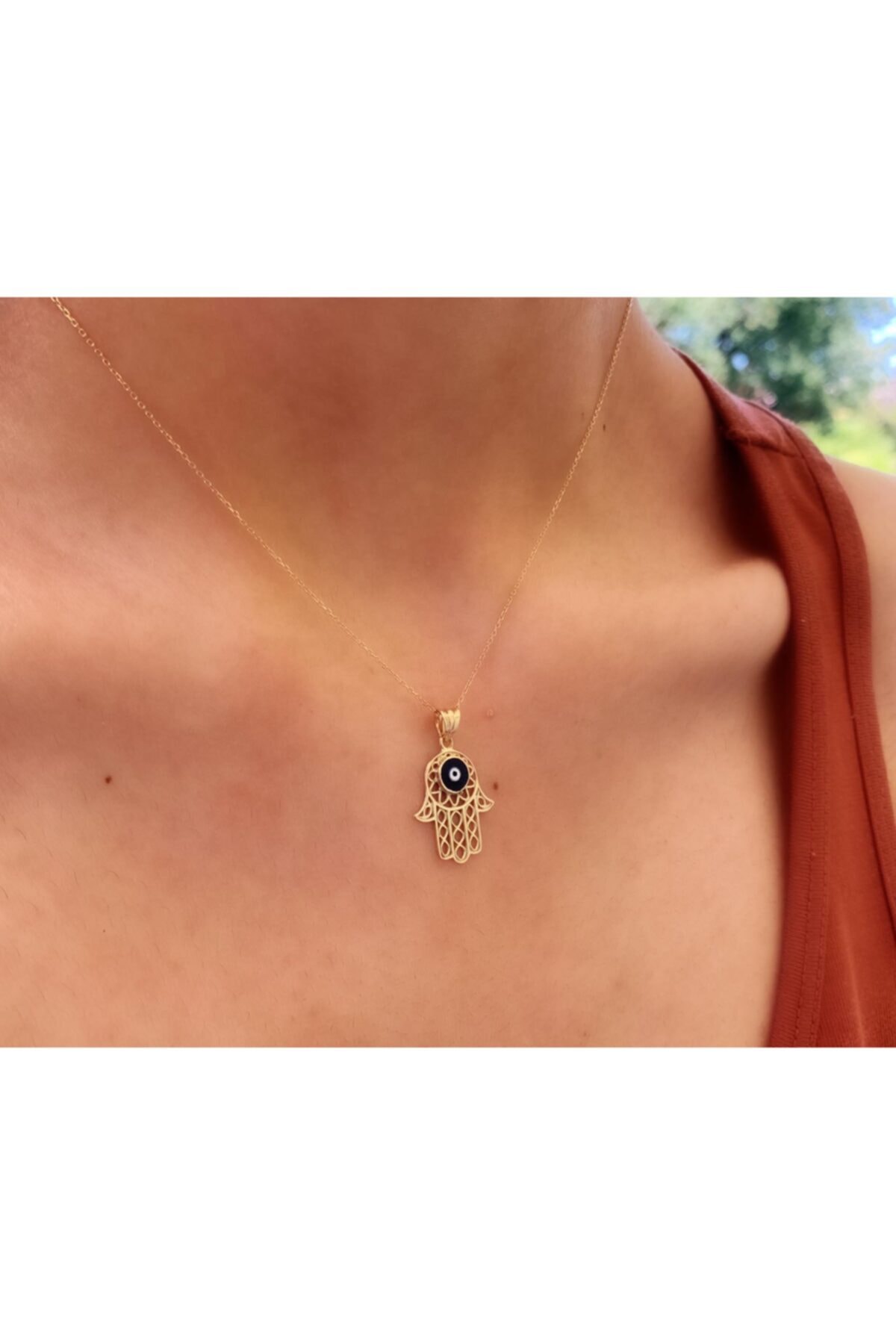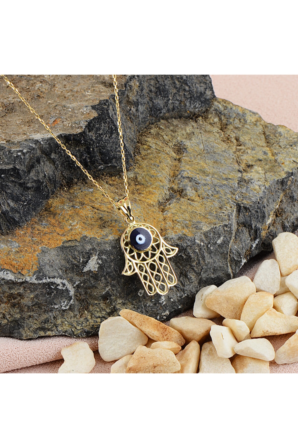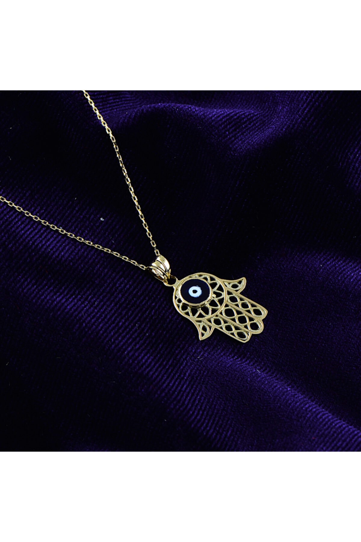 2,15 gram ağırlığında ve zincir uzunluğu 45 cm’dir. Fatıma’nın Eli işlemeli kolyemiz 14 ayar altındır.